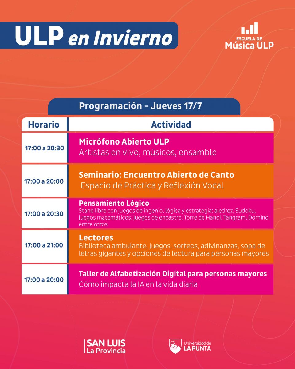 La programación incluye actividades como talleres de canto, guitarra, composición musical, música puntana, conciertos de ensambles, y una atractiva oferta de propuestas para quienes disfrutan de la lectura. También habrá juegos de ingenio y un taller de alfabetización digital para personas mayores.