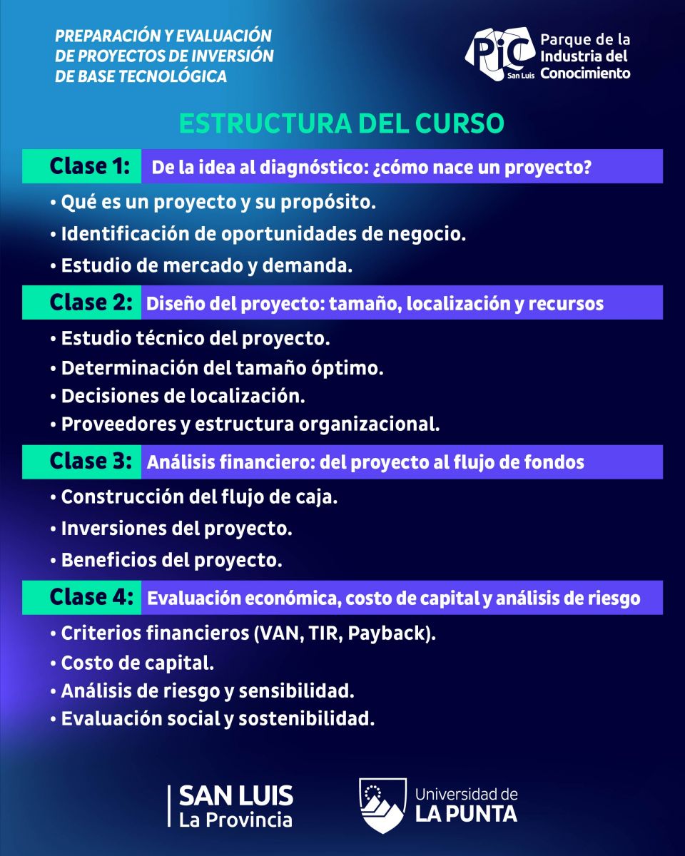 El curso estará a cargo del Lic. Ciro Ricci, representante en San Luis de la consultora Data Miazzo y QTM Capital, firma especializada en asesoramiento económico financiero y en formulación de proyectos. Las clases se dictarán de manera presencial en el SUM del PIC los días miércoles 19 y 26 de noviembre, y el 3 y 10 de diciembre, de 17:30 a 19:00, con una duración total de cuatro semanas.