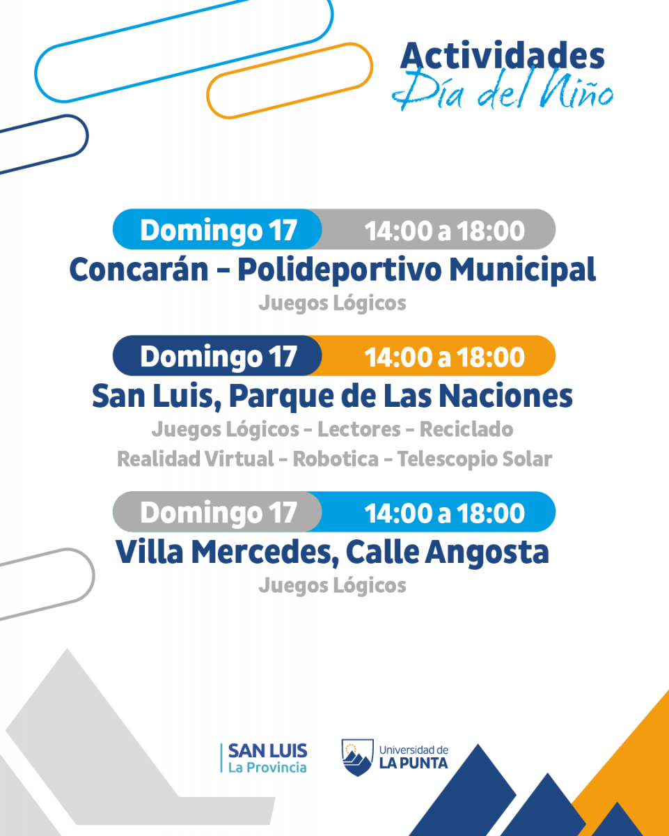 El sábado los juegos estarán en las plazas principales de San Pablo, Naschel y en la Plaza de los Niños de La Punta, mientras que el domingo habrá actividades tecnológicas y científicas en el Polideportivo de Concarán, en el Parque de las Naciones y en Calle Angosta.